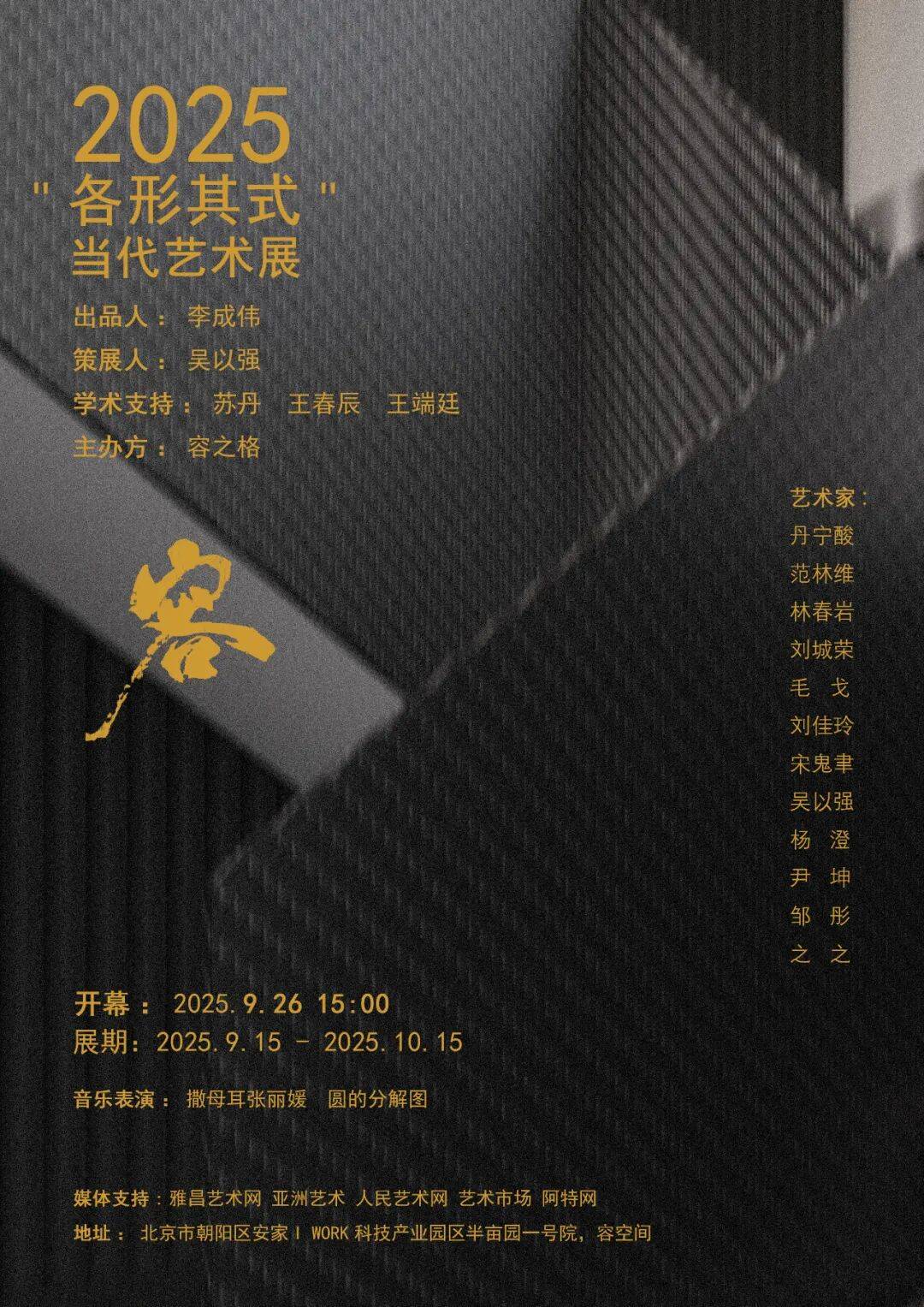 时间来到2025年9月,李成伟在安家文创园区开办“容”空间,再次启动艺术介入空间的活动,这次命名为“各形其式”的展览延续了对艺术家及其作品的个人性与品质的要求,选择了在这个时代中坚持自我持续发力的部分代表性艺术家。他(她)们一直在各自的轨道上切入艺术本体,呈现出各自不同的面貌。所有的思考与实验探索必然带来某种形式的结果,展题中的“各形其式”居于各行其是的切换,毫无违和感,长期的各行其是具体到艺术作品上是全然不同的形式结果。