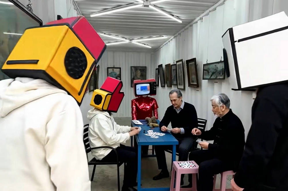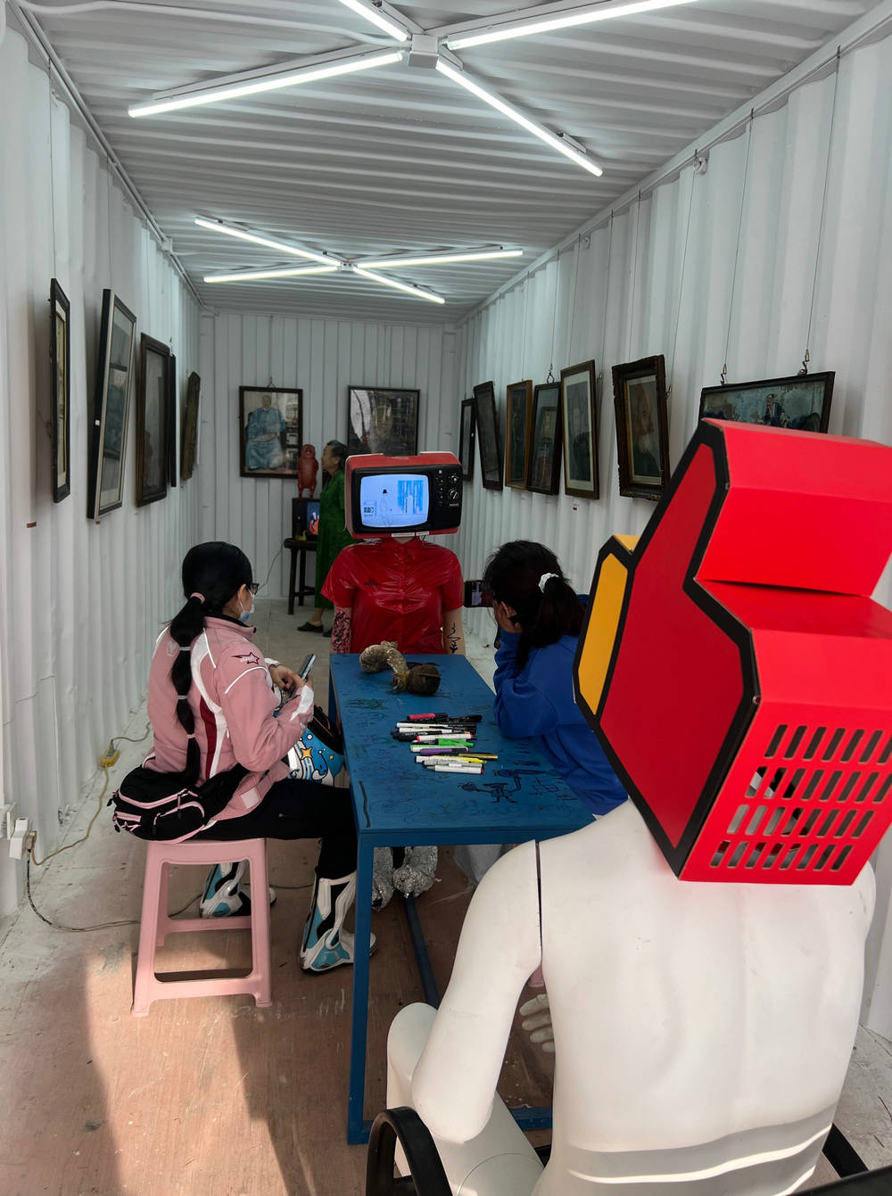 集装箱中间一条蓝色长桌,电视头的人偶坐在一头(播放烈子&苏菲的达达主义数字行为艺术ni作品)。另一侧坐着邓震的点赞人模。两侧给观众放置了椅子。