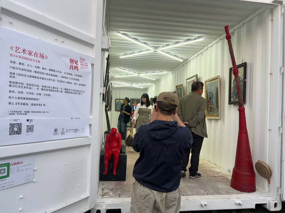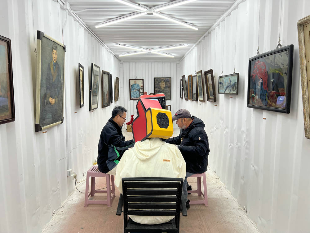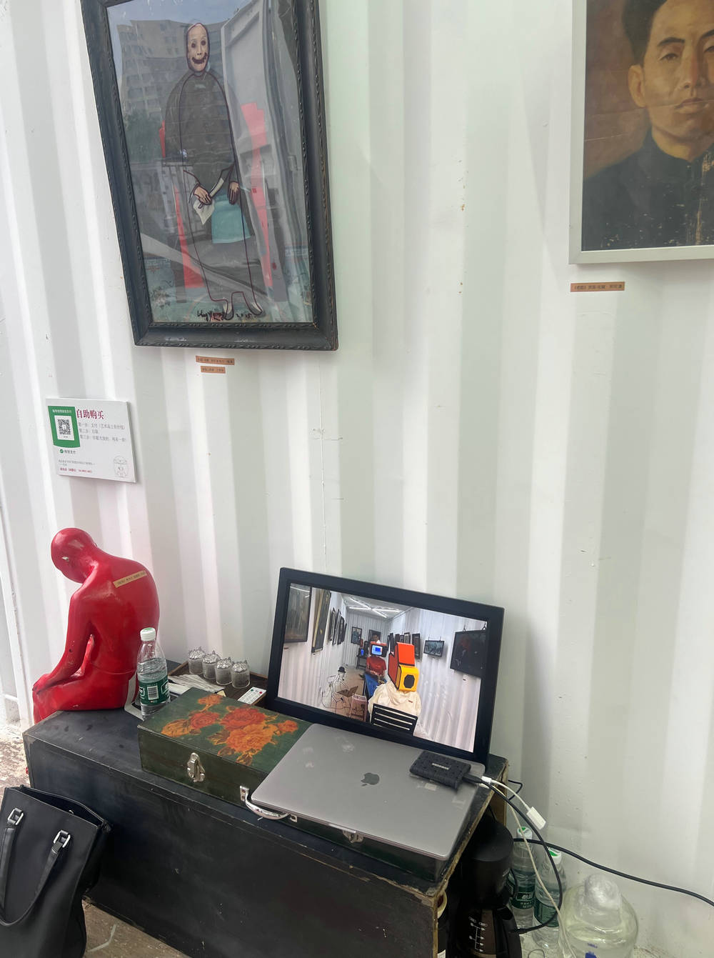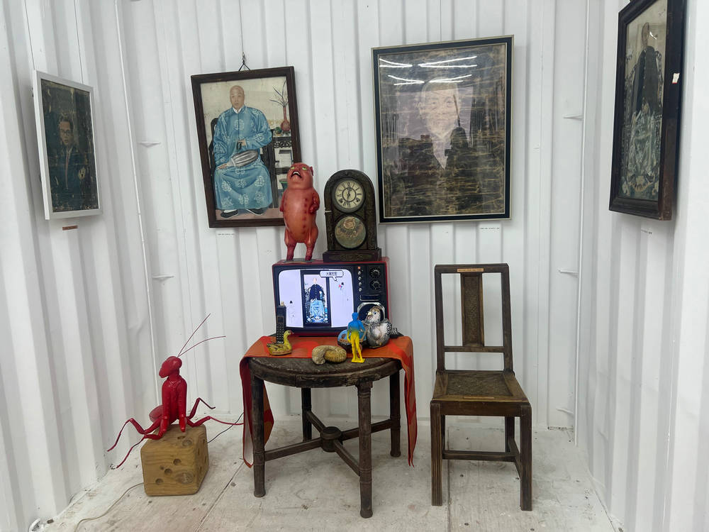 (戴桾这次策展很好玩,他说“重要的不是艺术作品,是艺术家”每个集装箱布置成艺术家本人的生态场景,私生活(艺术生活)景观化。走进每个箱子都有人的趣味在,林林总总,小物件,咖啡器具,茶台、架上待完成的画作、主人的癖好收藏。)
