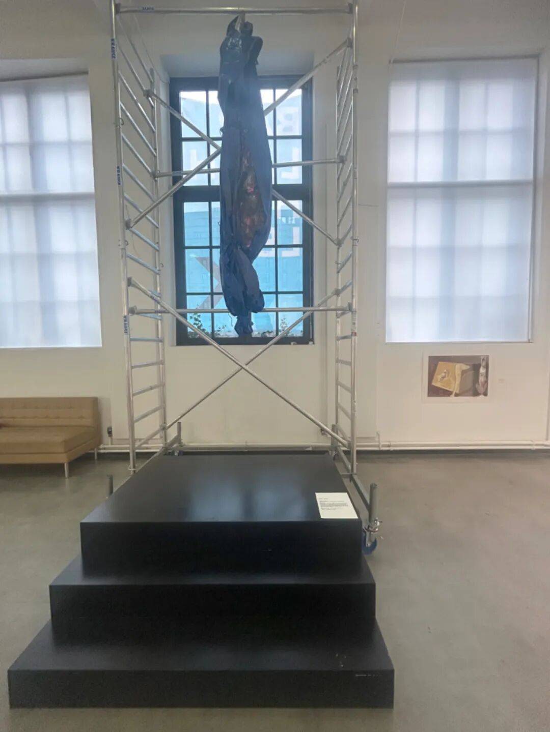 Medium::A210X1000 cm, cosmic energywork (canvas, gouache) is rolled,mixed withrainwater and soil from Hamburg, Germany,wrapped in plastic sheeting,bound with nylonropes,suspended from scaffolding,with a blackaltar placed in front.
