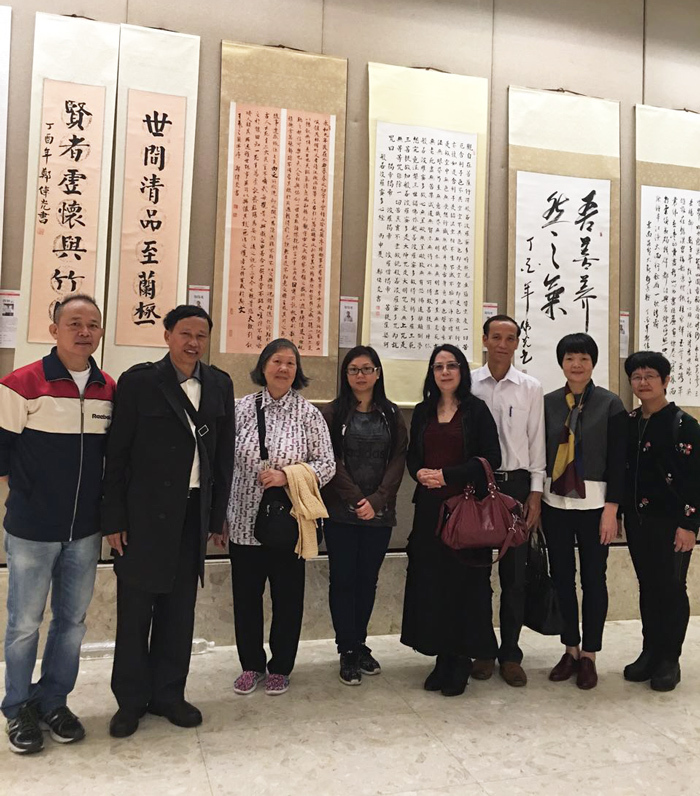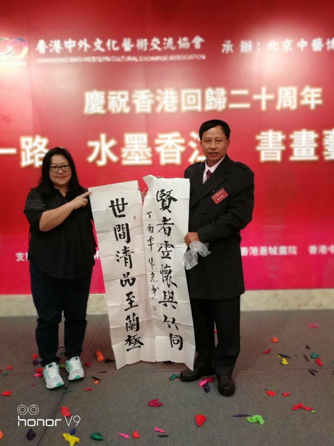 来自广东中山的著名书法家郑伟光先生,作为本次活动的特邀参展艺术家,展出了6幅极具代表性的精品书作,作品内容丰富,引人入胜,风格多变又不失魅力,可见其功夫颇深。为了共同庆祝香港回归二十周年,同时能够一睹郑伟光先生的书艺风采,各地友人纷纷前来祝贺。展览现场,郑伟光先生崇德尚艺的人格魅力更好地推进了本次活动的圆满举行。